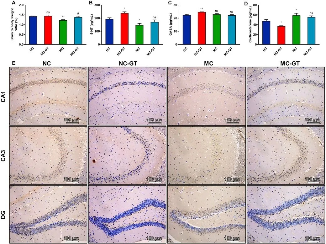 在观察到的绿茶可以改善行为之后,我们研究了绿茶对抑制性神经递质、激素水平和海马结构的影响。相比于空白对照小鼠,模型小鼠脑重量较低,5-HT水平显着降低和皮质酮水平升高,表明存在脑萎缩,这是抑郁样行为和认知障碍的潜在标志物;而在外源性给予绿茶后,小鼠海马5-HT和GABA水平显著升高,而皮质酮水平显著降低。这些发现表明,绿茶通过调节抑制性神经递质和减少皮质酮分泌来缓解抑郁样行为。