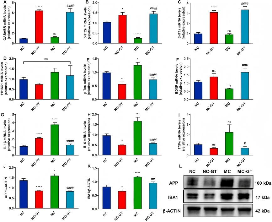 为了证实绿茶的效果,研究人员检查了大脑皮层中的基因和蛋白质表达。qPCR显示模型组小鼠γ-氨基丁酸B受体1(GABABR)、5-羟色胺受体2A(5-HT2a)、5-羟色胺受体1A(5-HT1a)和脑源性神经营养因子(BDNF)的表达被显著抑制;羟基类固醇11-β脱氢酶1(11HSD1)、p-tau和促炎细胞因子白细胞介素1β(IL-1β)、白细胞介素 6(IL-6)和肿瘤坏死因子-α(TNF-α)表达升高;而给予绿茶后,小鼠炎症相关基因表达降低,表明其在减轻神经炎症和支持神经元修复方面的作用,从而缓解抑郁和认知缺陷。Western blotting分析显示模型组的APP和IBA1水平升高,绿茶显着降低了这两种水平。这些发现突出了绿茶提高神经递质可用性、减少神经炎症和减少纤维蛋白积累的能力,增强了其对抑郁症和认知功能障碍的神经保护作用。
