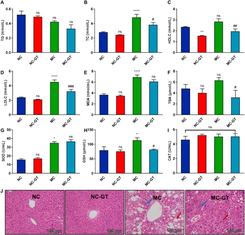 实验过程中检测发现饮用绿茶显著抑制了小鼠体重增加,逆转了脂肪堆积,并减轻了肝脏肥大。对此,研究人员评估了血脂水平和氧化应激标志物以探讨其对肝脂质代谢的影响。检测发现绿茶可减少脂质过氧化,减轻肝脏损伤,并恢复被认知障碍及抑郁症破坏的脂质代谢。