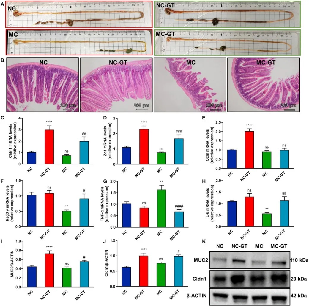 先前的研究表明,压力会损害肠道完整性,增加通透性和炎症,从而加剧抑郁样行为。对此,研究人员分析了小鼠的肠道结构以及相关基因和蛋白质表达,检测发现相比于空白组,模型中小鼠肠道长度缩短、小肠绒毛存在严重损害,而绿茶有效地逆转了这些结构损伤,还升高了连接相关基因的表达,包括 Cldn1、紧密连接蛋白 1 (Zo1)、闭合蛋白(Ocln)、MUC2 和Cldn1蛋白水平,降低严重因子表达。这些发现强调了绿茶通过恢复肠道屏障完整性、减少炎症因子表达来保护肠道健康。